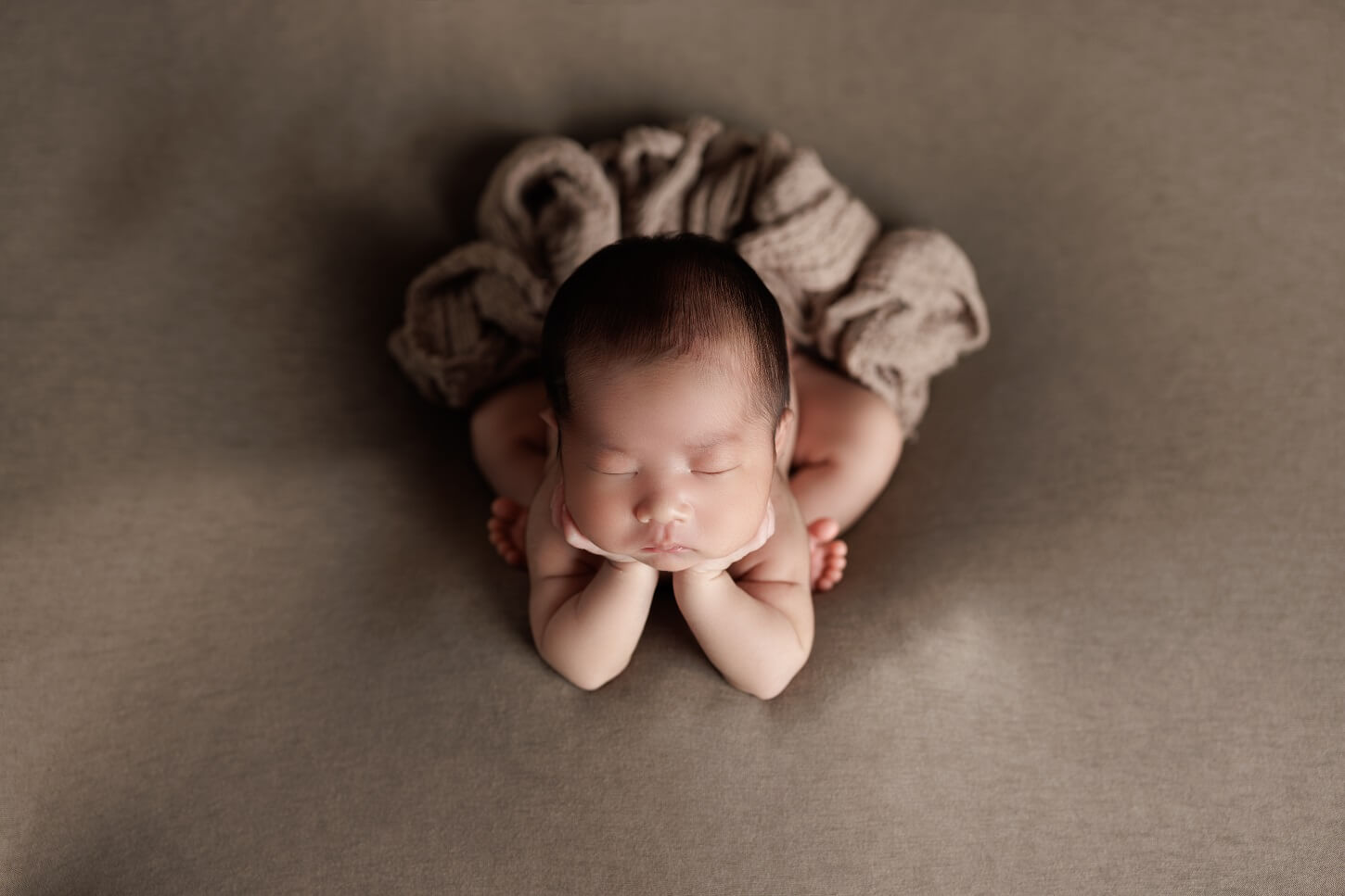 生後2週間以内であれば、その「胎内のポーズ」を自然に再現することが可能であり、赤ちゃん自身もその姿勢に安心感を覚えます。生後15日を過ぎる頃から、赤ちゃんの体は少しずつ外の世界に適応し始め、手足を元気に伸ばす力が強くなっていきます。筋肉の発達とともに、無理に丸まらせることが難しくなり、深い眠りの時間も徐々に短くなっていきます。また、生後まもない時期は眠りが深く、撮影中の微細なポージングの調整にも反応しにくいため、安全かつスムーズにアートな姿を収めることができるのです。完璧なニューボーンフォトを残すためのベストタイミングです。